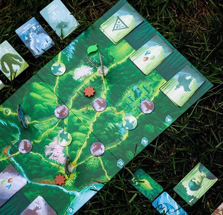 Gameplay revolves around players playing “Seekers” on different lore tokens in order to gain control of either a token or a shrine. Seekers have two numbers on each card, one for the lore tokens, the other for the shrine. Whenever Seekers clash, players reveal any face-down cards, compare both stats, and resolve the lore token and the shrine on the board. The different lore tokens, as well as the balance between Lore and Shrines creates a tug-of-war between the two players, each trying to win in one area of their focus while not entirely ceding other aspects to their opponent.